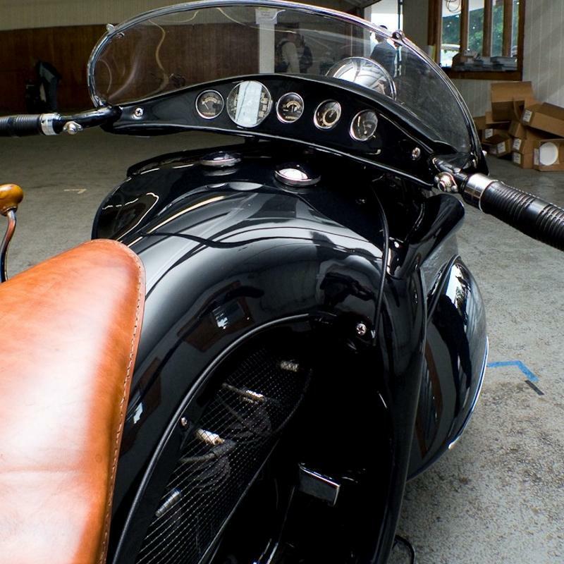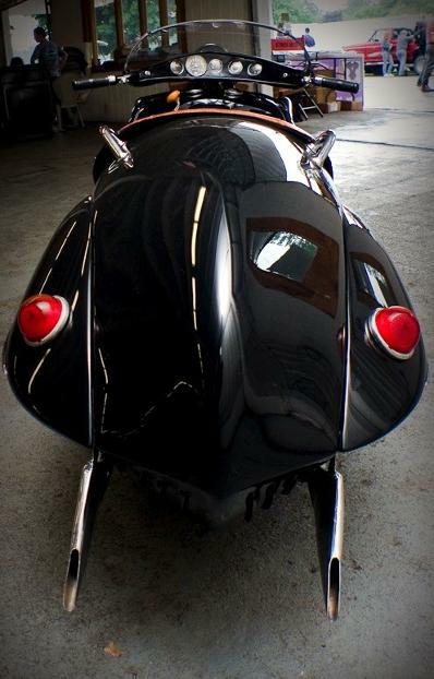 I took these photos at the Rhinebeck Grand National Meet where the newly restored bike was unveiled. The bike belongs to Frank Westfall from Syracuse, NY. According to some info I found online, the bike was originally built by O. Ray Courtney in 1936 and is based on a 1930 K.J Henderson. The bike is powered by inline four cylinder (not a scooter as some have said, check the shot of the motor below) and as I’m sure you can gather by now, is a one-off custom. What I can confirm is it does run and while it looked a bit unwieldy, Frank could be seen riding the bike around the 1930 Henderson StreamlinerFairgrounds all weekend. But let’s be honest here (and maybe I’m wrong) – you don’t have this bike in your stable to go out for a long Sunday afternoon ride to get some ice cream. That said, it was pretty awesome to see the bike being ridden (even when rain started to come down) instead of being sheltered behind a velvet rope, never to see the rubber touch asphalt again. The bike is a fantastic piece of history, the craftsmanship is absolutely stunning and it’s surely more of a museum piece than a daily rider. Frank has obviously spent an incredible amount of time meticulously restoring and rebuilding the bike to its current gorgeous state. Hats off to Frank for the amazing work he did and for sharing it with all us gawkers.
