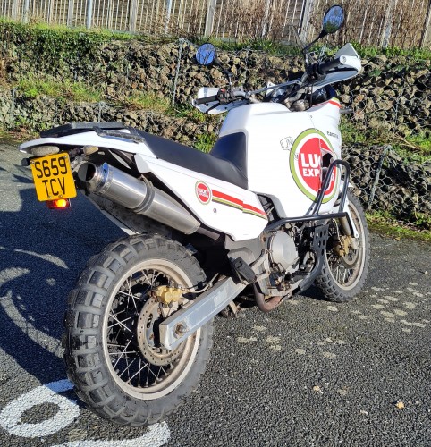 The bike sports the Lucky Explorer livery but it is NOT an Elefant 900ie – its original colour was dark blue and it was painted in its current colours around 2019. Even though this was a professionally done paint job, the bike does look a bit tatty so to speak, due to having been parked outside (under covers).