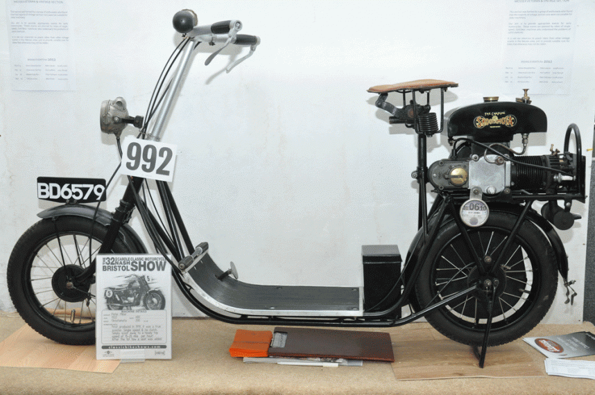 This unusual machine was on display at the 2012 Bristol Classic Bike Show. First produced in 1919 it was a true scooter with a single speed box and no clutch. It boasted a top speed of 15-20mph. The first few made did not have a seat….