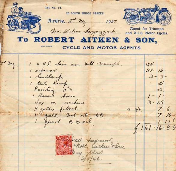 Add Your Photos!Thanks to Carrick Watson for this photo showing his Father, Jimmy Watson, with his brand new Triumph 4HP Chain cum Belt which he bought in May 1922. This was his first NEW bike so he also kept the receipt! Up to this point he had only had secondhand machines, must be why he got all dressed up for the photo!! Also Attached is the receipt, makes interesting reading … showing what was extra! Nothing changes ……