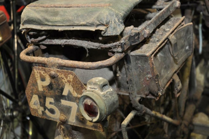 A absolutely stunning “barn find”. This incredibly original AJS was laid up in 1931 when its owner was “done” for speeding and was so embarrassed, he put the bike away – not to be moved for 79 years!