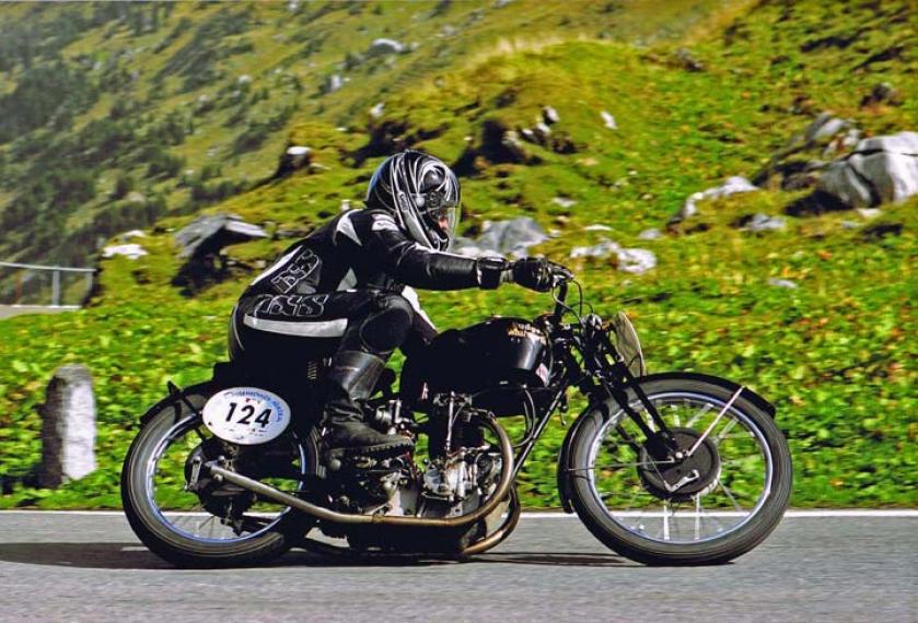 Add Your Photos!Thanks to Alex Rümmel of Switzerland for this picture. Alex has won the Klausen Memorial hillclimb in Switzerland (21,5 km, 140 bends, 3200 ft height difference from start to finish) 2 times in a row. The bike is a 500 Rudge-Whitworth, 1929/30 Ulster Grand Prix, 550 cc, running on methanol, and is apparently a lot of fun to ride (as you can see!).