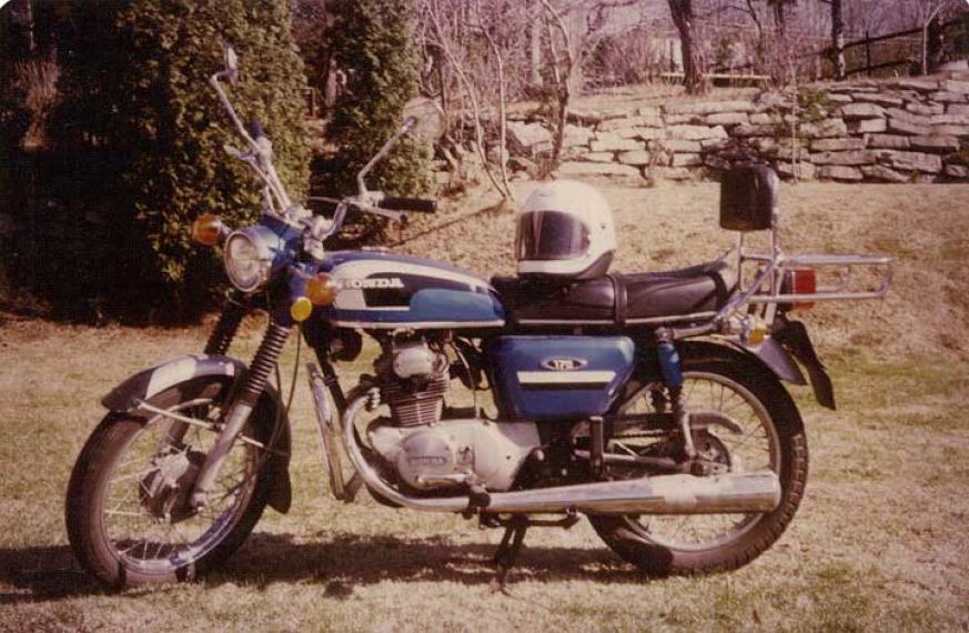 Honda CB 175 1971. Twin carbs. stripes on side and black paint on front fender are not original. Picture by Sono, 1979