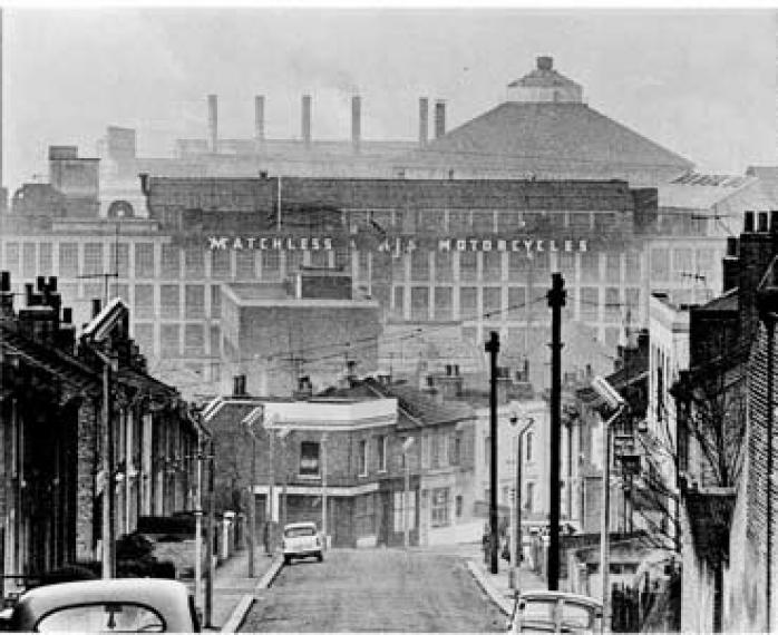 Probably a long time out of date now, but I was also fascinated by the photo of the old Matchless/AJS works in Plumstead so much so that I too wanted to trace exactly where it was. From my searches I can now understand the factory location. Sadly it appears I cannot attach photos so a description is all I can offer. If one stood to the side of the current Foxlfield Primary School building looking north, that is just about where the original photographer stood to take the factory shot. All the roads and side streets in the shot looking down the hill are gone. The factory was across the railway line between the still existing Heronsgate Primary school, and the top end of Maxey Road where it joins Plumstead Road. It’s the area now known as Jessop Close. I hope that’s enough detail for you to place it, but contact me if you’d like a copy of the location map I found.
