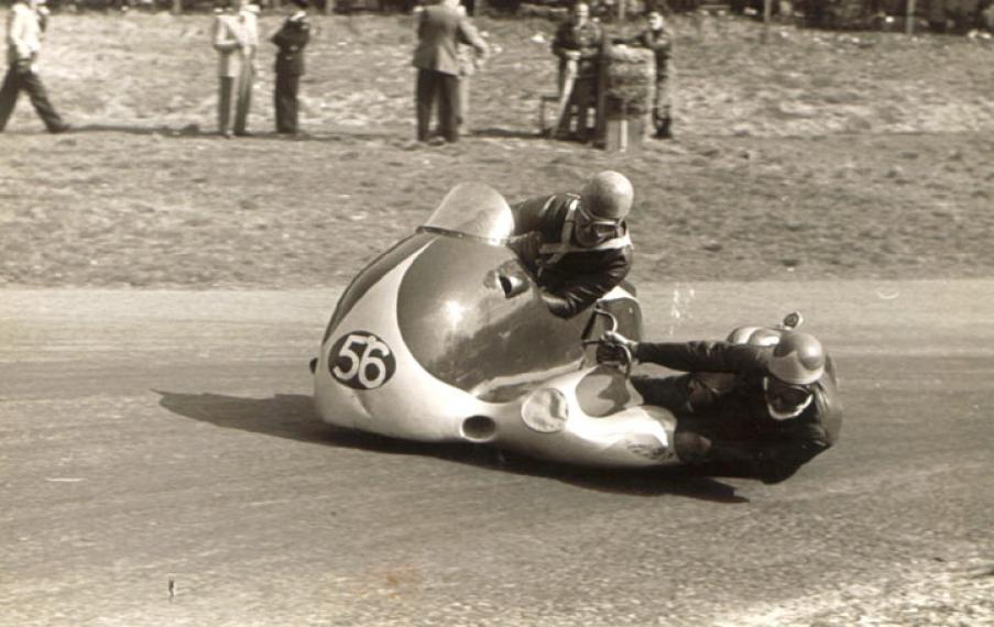 Bill Beever and his passenger Bill Mundy at Cadwell Park in around 1956.  Thanks to Richard Mundy for this picture.