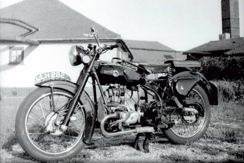 Add Your Photos!Thanks to Pete Beach for this picture of his father’s bike. It’s a late 1940′s 350cc T35, the first transverse twin made by Douglas and later to become their hallmark. The engine and gearbox unit were mounted in a duplex frame with pivoted-fork rear suspension and short leading links at the front. Both were unusual in that the suspension medium was torsion bars, and the rear ones ran alongside the lower frame tubes. Pete’s father described as being "like riding a bed"