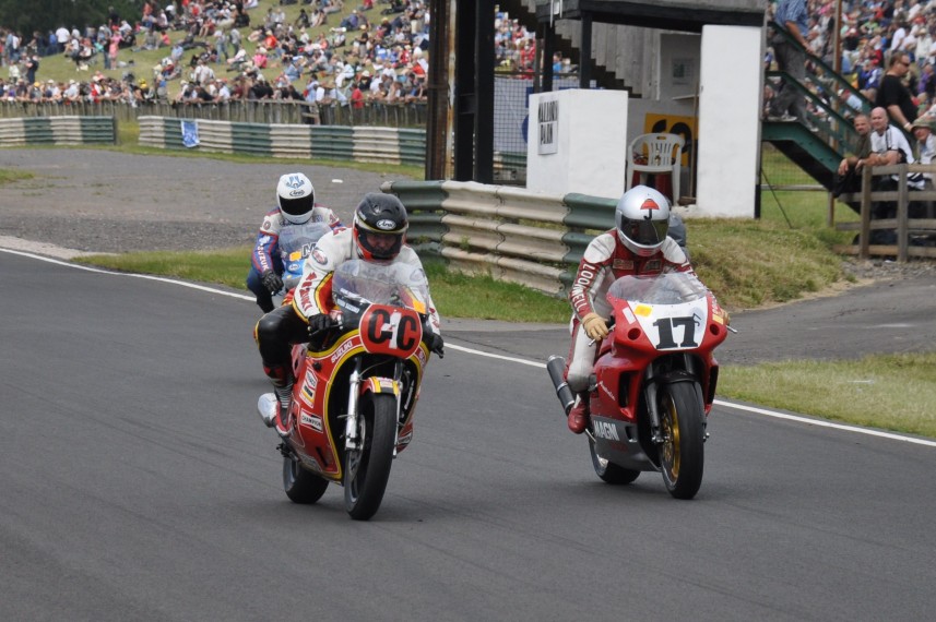 Graeme Crosby Suzuki XR69), John Davis (Magni Australia) and Mick Grant at the rear (Grant RG500) at Mallory Park.