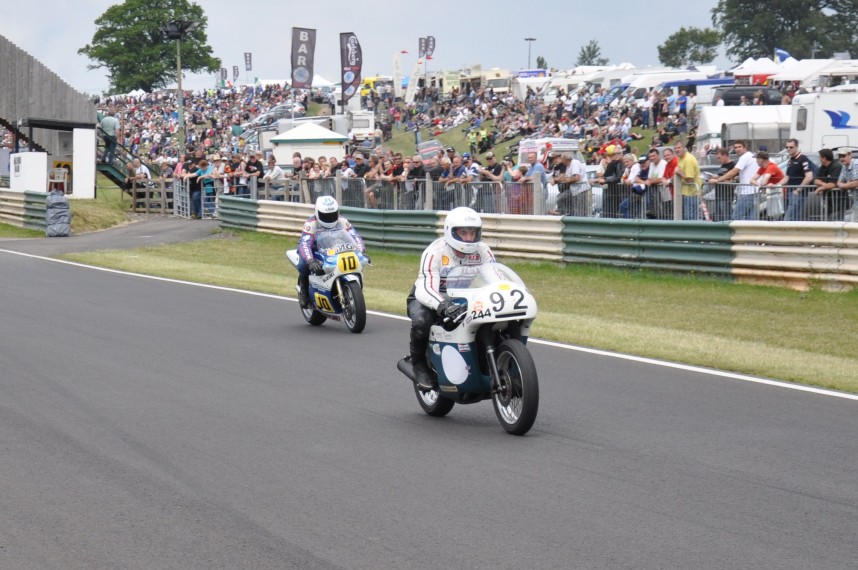 Tony Smith on his Yamaha TZ750 being chased by Mick Grant on his RG500 as they approach Gerrards at Mallory Park.
