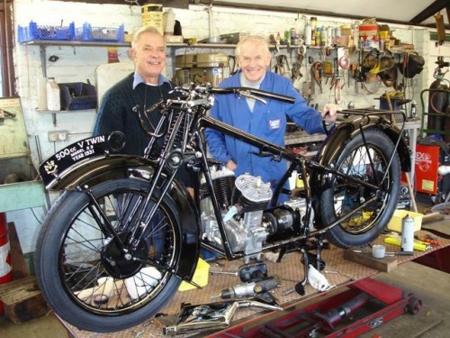 BMCT trustee John Kidson with Sammy Miller just 12 weeks after work started on a total restoration of an AJS S3.
