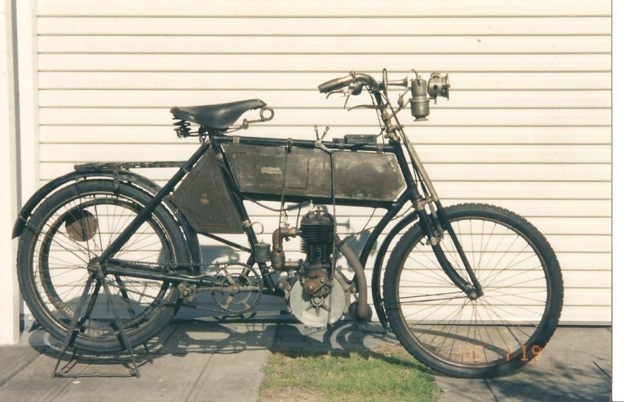 The thing that amazes me is how did such a rare make of machine find its way to Tasmania in around 1905. We got the bike in 1971 from a fellow who got it from the original owner’s widow in Hobart Tasmania in about 1966. As you can see it was and is in basically original condition. I rode it in many events for several years but have not got the light pedal assistance to start it now, Cheers Dean.