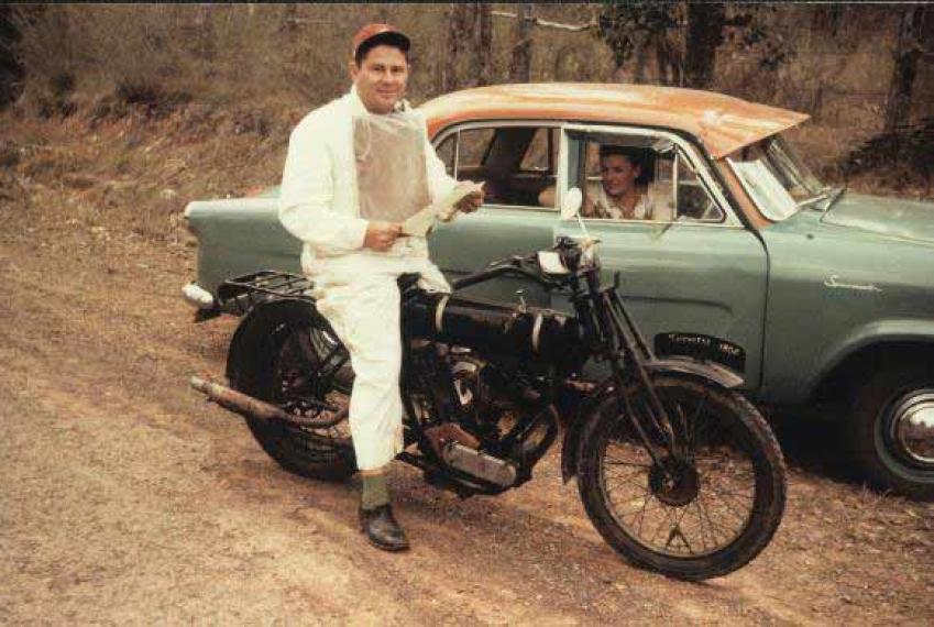 The bike would appear to have had some modifications carried out to it….the forks look to be slightly later and also the steering head now sports a sidecar lug…..I think that was the work carried out by the repairer! Not sure when the racy exhaust was added. Laurie rallied the bike extensively in the 1960’s and 1970’s and I have a photo of him on it around that time. I purchased it from Laurie together with a 1930 OHC Humber and a 1919 Indian Powerplus in 1998. Laurie died shortly afterwards.
