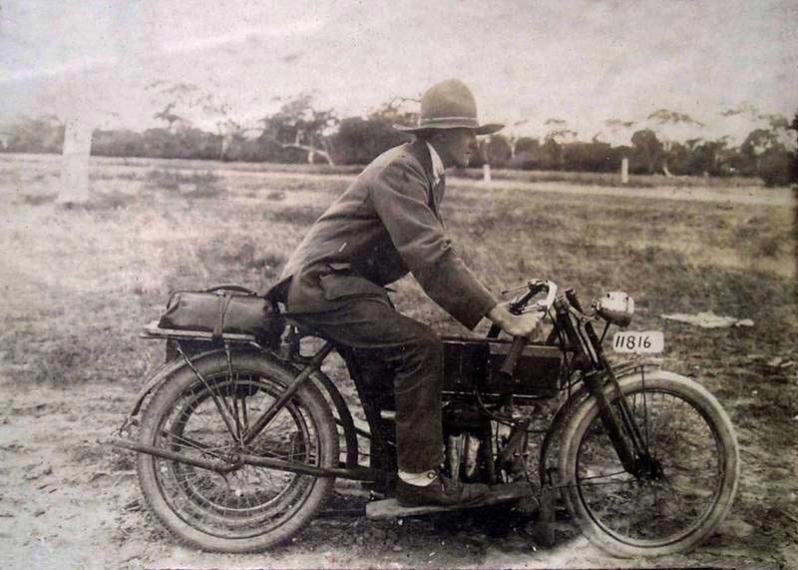 Further thanks to Brian Forth for providing further information. The owner of the motorcycle is his great-great uncle, Hartford Scott, of Currency Creek in South Australia. The family cannot accurately state when the photo was taken, but it was taken in the paddock next to the family home. Brian uses this picture as part of my business identification (he supplies beaded edge tyres) at http://users.chariot.net.au/~brianforth/BeadedEdge.htm