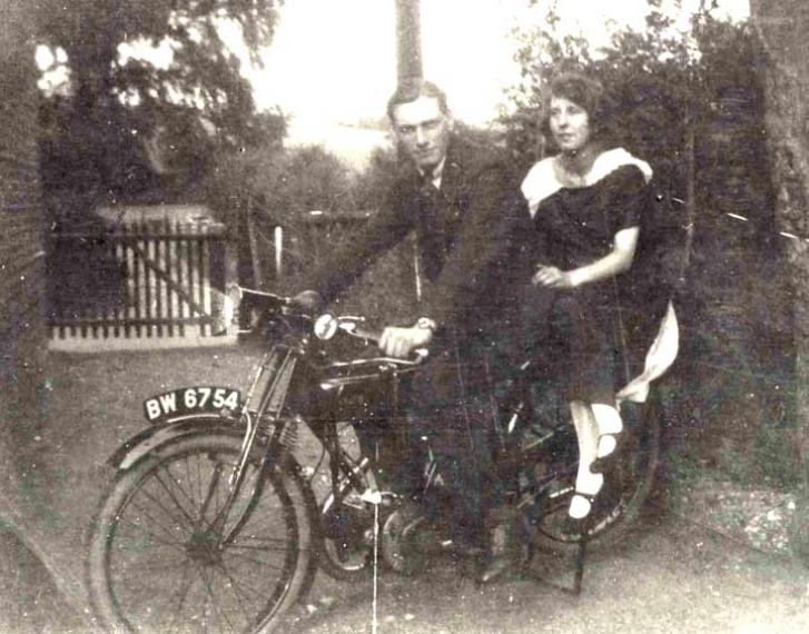 with the rim brakes, its a 1923ish AJS b model looks to be OHV , very nice,looks quite new in the picture, proud lad from Oxford way.