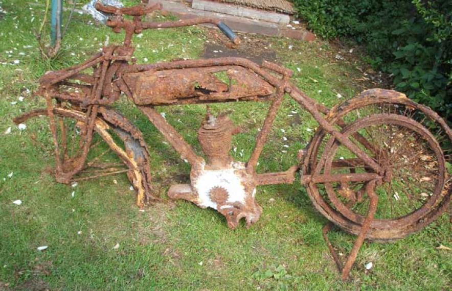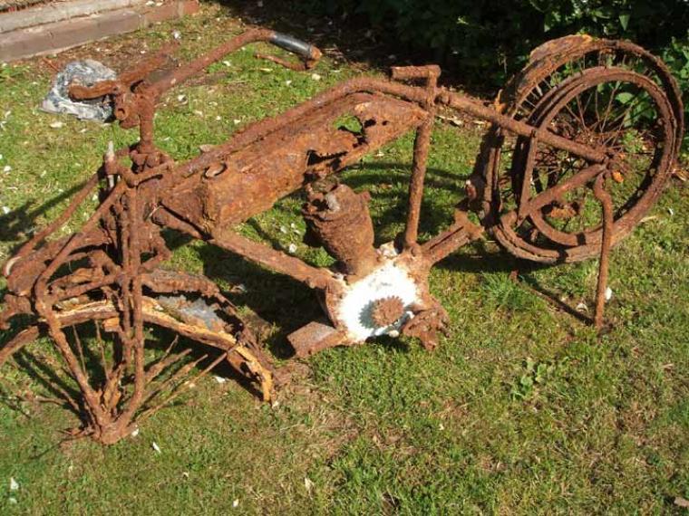 Add Your Photos!It doesn’t have to be shiny to get on this site! This was discovered by Dave Greaves whilst digging some foundations for his shed! And thanks to the guys on the forum for this info "it is a 2 3/4 hp touring Royal Ruby of about 1922. The 3 hp has the two side stands but the 2 3/4hp has the conventional rear stand. It is the touring model as the sports model had downswept bars . All models had the Royal Ruby patent adjustable forks fitted with a laminated spring. As well all Ruby frames have patent safety stays fitted to the front down bar connecting the steering lug to the engine and "eliminating all chance of breakage to the front down tube" (i.e. it has 3 front down tubes as it has two supplementarys bolted on either side of the front down tube)." And the bottom picture shows how the bike will look after a tube of Solvol Autosol and a samll amount of polishing….