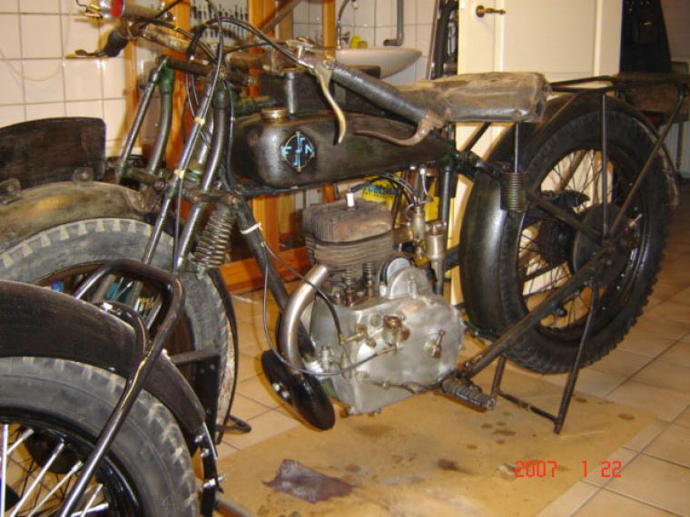 Thanks to Henk Antonissen for this picture of his 1928, 350cc sidevalve M70.  This is the last year of manufacture with with flat tank.  He hasn’t started it yet, but is confident that it will run.