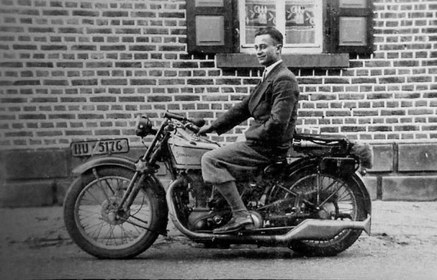 Add Your Photos!Many thanks to Jeffrey Miller for this picture. It shows his wife Trish’s Great Uncle Alfred Friedel. He was born around 1900 in Germany. The photo was taken sometime around 1930 in Kahl/Main Germany. The motorcycle is a German built Standard. Alfred’s expression says it all.