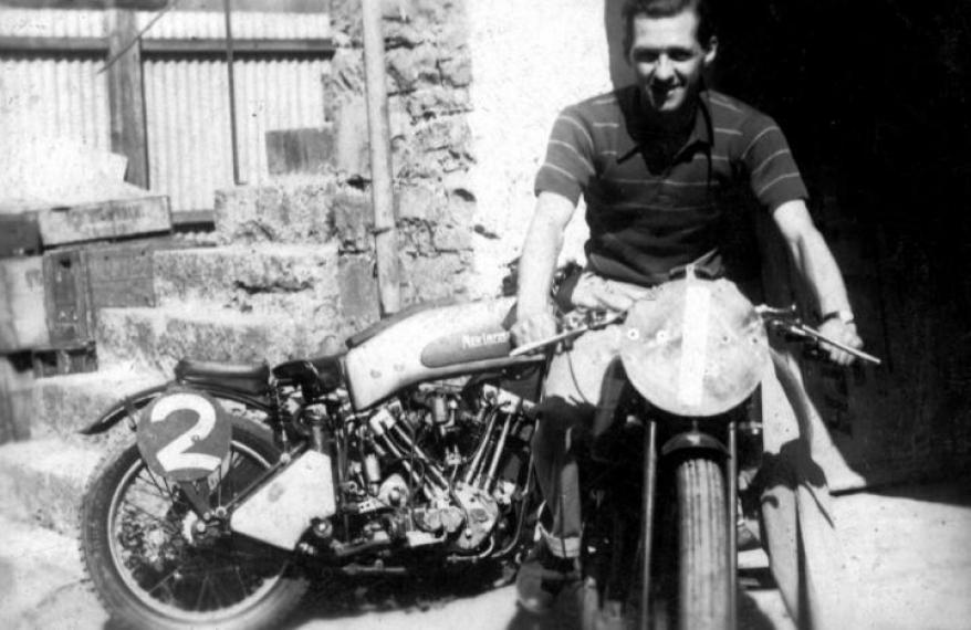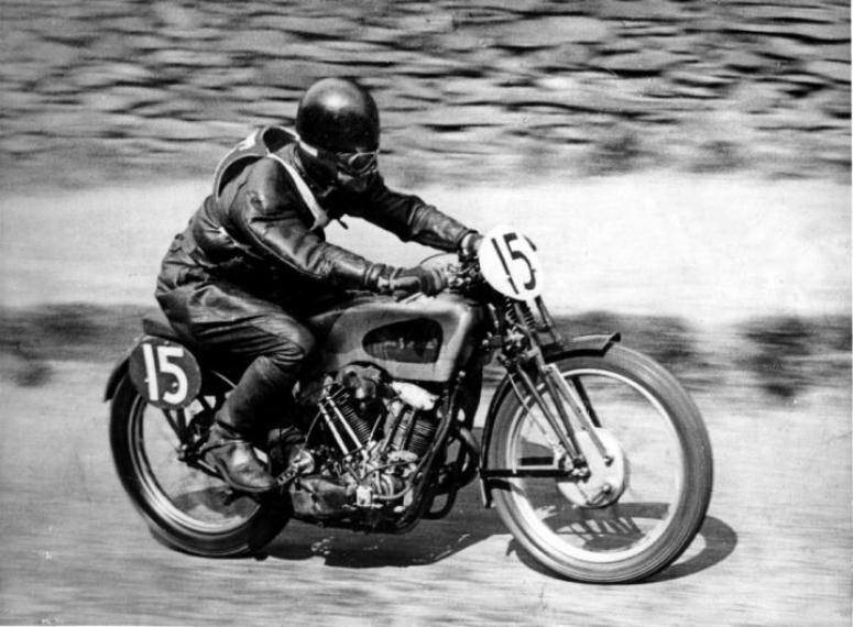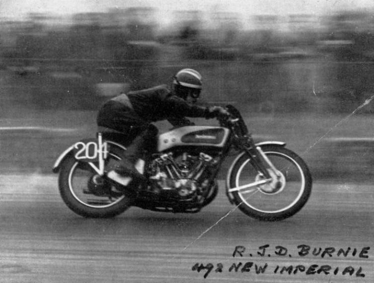 Add Your Photos!Many thanks to Steve Kitchen for these pictures of his grandfather, R.J.D. Burnie, and his 492cc New Imperial works racing machine. Mr Burnie was a winner of the Gold Star award for averaging over 100mph over a kilometer (he actually achieved 100.76mph) at the Southport Races in 1935. Amazingly, his gear change lever became inoperative due to sand, and he had to change gear by hand at about 90mph!
