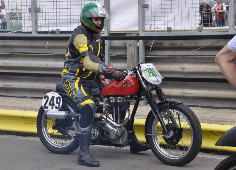 A 350cc Ariel Red Hunter in race trim seen at Mallory Park as part of the 2011 Festival of 1000 Bikes.