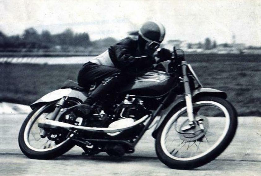 Thanks to Axel of Germany for this picture of a 1949 MM SOHC machine being test ridden at Modena. The 20 inch wheel was typically used by MM on their long distance racers.