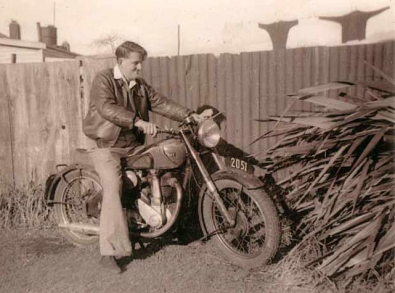 Heres a picture of Kev with his first bike – a 1950 BSA B31 in New Zealand. He reckons it was a great bike that he thrashed, but he never had any trouble with it,