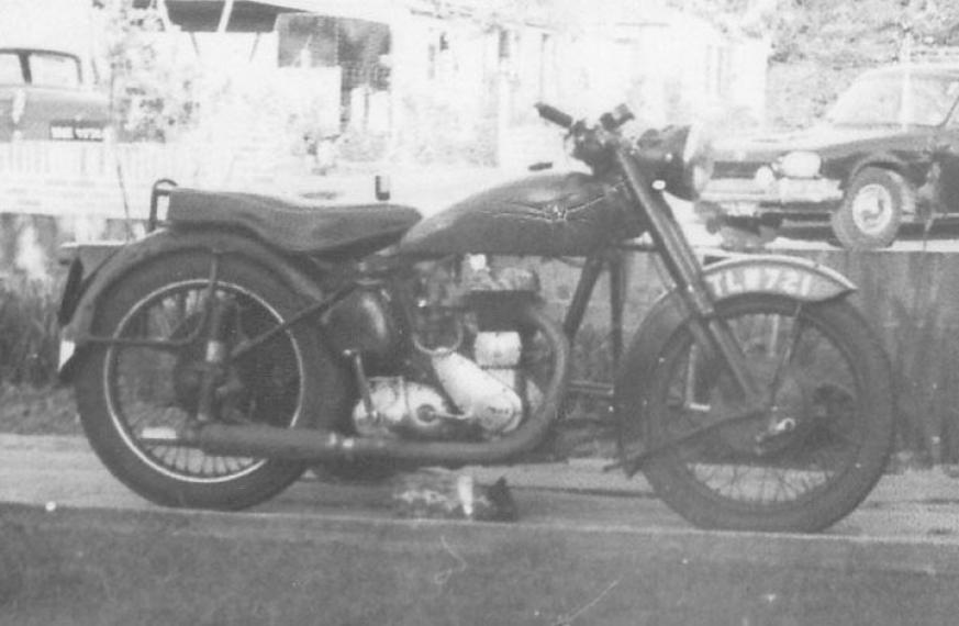 “A 1950′s model M20 combination….together with drip tin. I bought it off a friend who himself had just bought a 650 Gold Flash combination. This M20 holds many memories for the 1 year I spent with her. Going to a disco, 5 miles away, 7 up. 3 sitting on the bike (one on the rear mudguard) and 4 on the sidecar which was in the shape of a coffin….oh dear. Turning it over into a ditch and coming round 5 minutes after with me lying in the running water with the bike straddled from bank to bank immediately above. My pillion mate (Colin) lying in the road above, moaning or was it cursing. The side car wheel had clipped a water gully, on a left bend and flipped it over……at midnight. Then the day I took a short cut through a back street in Aldershot only to come across a police car with its contents blocking the road. Needless to say with the noise it was making (exhausts were always better loud) the contents emerged from the Panda and approached me. Get off he said and as I did so the ‘always loose’ seat slid down the side of the engine onto the road. He said very little, just, “take it home sonny and get it OFF the road. A lucky escape that one. Every morning as I tore off the work (apprenticeship) the guy at the bottom of my road would be stood at his gate shaking his fist……again such a loud exhaust noise at 7am was not good….but I was then young and he old. Anyway, girls came along and cars so I had to sell her. That day is as clear to me know as then. A soldier from Crookham camp came along, handed me the £11, I handed him the bike and my old crash helmet and away he tore down the road, no questions asked………not even a test drive. The day I removed the sidecar and took it for a spin but had great difficulty cornering due to the large square profile tyres…..plus I was on a provo licence. those were the days…..my short biking days”
