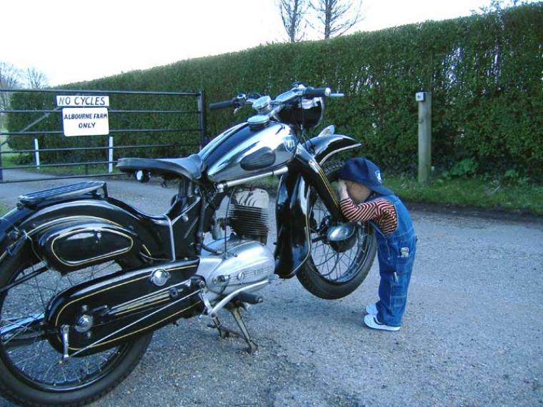 Thanks to Bernie Stevens for this picture of a 1952 NSU Lux.  Now is that a VERY small child or an adult looking at a VERY large bike….?