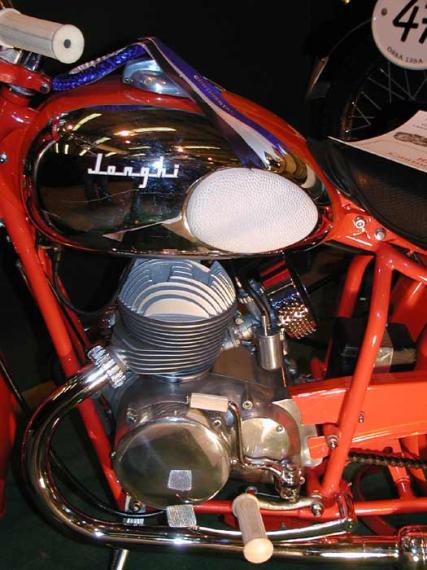 I’ve never seen one of these before!  It’s a 1953 250cc Jonghi H54T restored by its current owners.  Apparently Jonghi were one of the great French names of motorcycling, but I have to confess I’ve never come across one before. This one was shown by the Shrivenham MCC at the 2005 Bristol Classic Bike Show.
