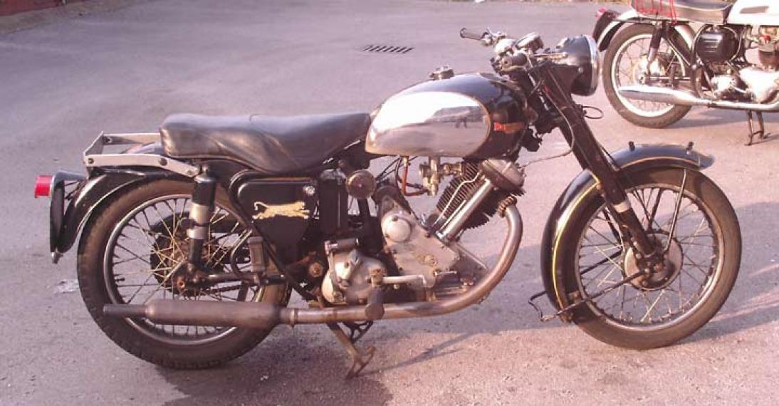 A 1954 600cc Panther M100S – the first with a swinging arm rear suspension and a single port head.