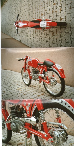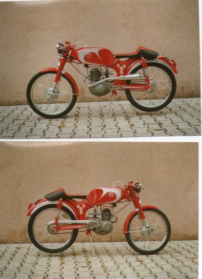 L’originale era pronto per la demolizione, guardandolo mi ha fatto pena, così ho deciso di trasformarlo per un mio nipotino ( Stefano ). Per l’anno 1957, era già provvisto di : forcella ant rovesciata, frenata integrale, frizione a secco. Mi sembravano trè qualità sufficienti per fare questo lavoro. Con trè marcie, fà 90 km/ora. La fabbrica era nata come antagonista della MOTOM, purtroppo non ha durato molto. Ciao Mauro.