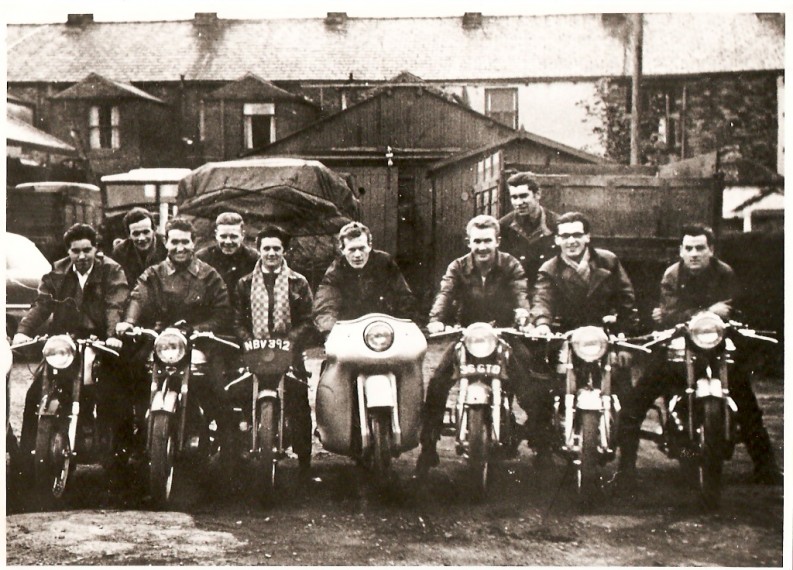 The photo shows Keith Topham Norton, John Briggs Triumph, Pedro 175cc Gilera, Jack? Ariel Arrow, Myself, Andy Walmsley Norton, Another Jack ? Norton, Joe Baron Triumph.