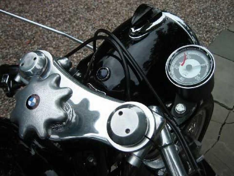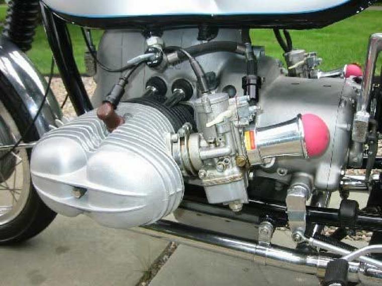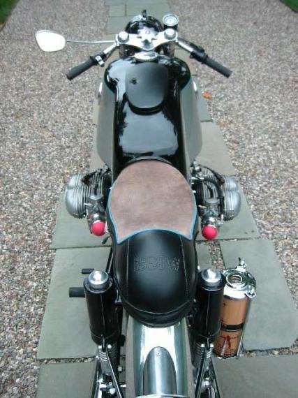 Add Your Photos!Many thanks to Ken Lloyds of the USA for these pictures. This custom started life as a 1961 R50. Engine mods. include, Bowman lightened alloy flywheel, R69S pistons w/ lightweight wrist pins, polished and balanced R69S crank, flowed heads, Delorto 32 mm pumper carbs., sport cam and valve springs, Bowman deep oil pan and polished billet velocity stacks. Other modifications are; Hoske 8.5 liter tank, Police headlight bucket (no speedo), NOS Albert long reach mirror, New Old Stock VDO cam driven tachometer, Benelli Toronado 4 leading shoe front brake, Custom built up forks from /6 legs, upside-down upper and lower triple trees machined & polished from / 5 components, final drive and transmission custom machined & lightened, Magura Rennsport clip-ons, Borrani alloy rims, S.S. spokes and nipples, wild fabricated rear sets, alloy fenders, R69S headers with Norton mufflers, custom cafe’ seat, Domiracer taillight, Koni shocks, electric’s and controls a combination of Bosch and Magura, Metzler ME77 tires and finished with Glasurit paint. FAST, BEAUTIFUL and VERY RELIABLE