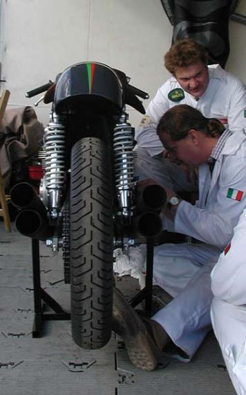 A 1965 Benelli 350/4 GP ridden by Alan Cathcart at the 2005 Goodwood Revival. Don’t you love the overalls the mechanics are wearing. How do they keep them so white??