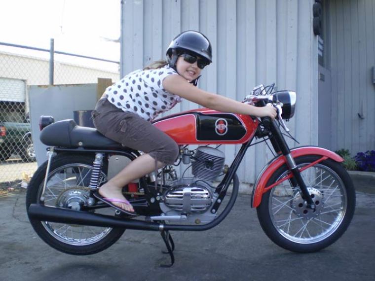 Add Your Photos!Many thanks to Apolo Orfali for these pictures of his 1968 Gilera 124 5v, 5 speed. The bike has a lot of modifications, including Dellorto 24 mm horizontal carburetor, a front brake with a build in air scoop for cooling, rear brake hub with drilled holes, a ventilated magneto cover, tacho fitted etc etc etc. The gas tank and seat are custom made. The girl is Apolo’s niece Ayelen on her 11th birthday.