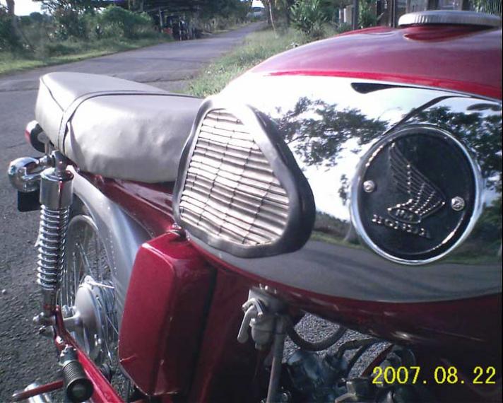 Many thanks to Isaac Stalin of Malaysia for these pictures of his bike: Model: Honda CD125 Year Made: 1969 Engine: Twin exhaust, single carburetor (modified with Honda EX% 100cc, new standard piston & block linear) Rim & Tyre: 16 inch rims & tyres Custom made seat, Dunhill Red/Silver paint job