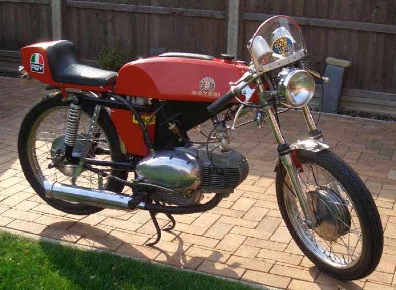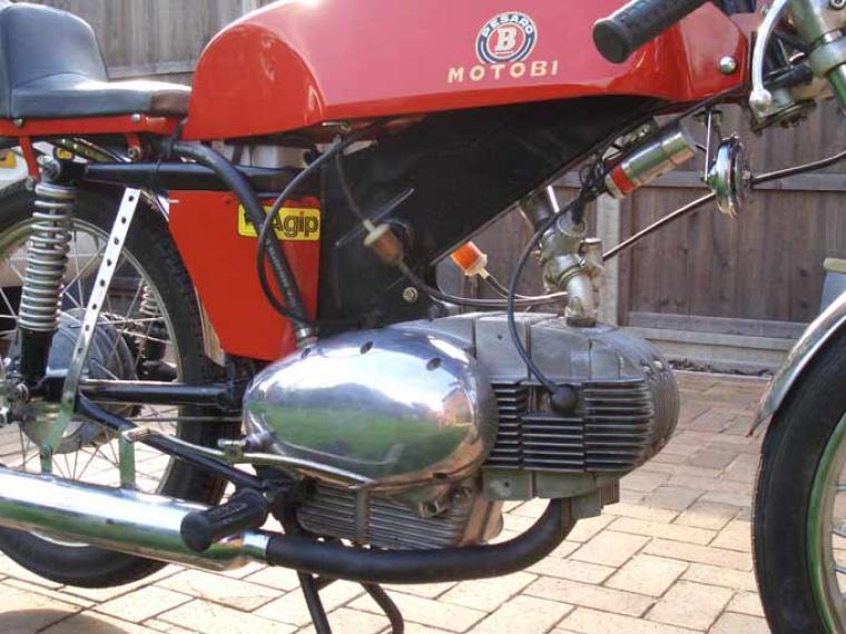A 1970 Motobi 125 Sport Special. The bike is affectionately know as an egg engine model and is very rare in this condition. It sounds and looks great and is a real head turner. This model was very successful on the track and won many races in the 50′s and 60′s and made Motobi a house-hold name. The bike is capable of a whopping 80mph and has great handling characteristics.  The engine is a single cylinder, horizontal four stroke producing 15 BHP at 8500 RPM. The clutch is a multi plate immersed in oil and the gear box is a five speed manual, foot operated. The front telescopic forks are Marzocchi and the rear swinging arm has adjustable shocks.
