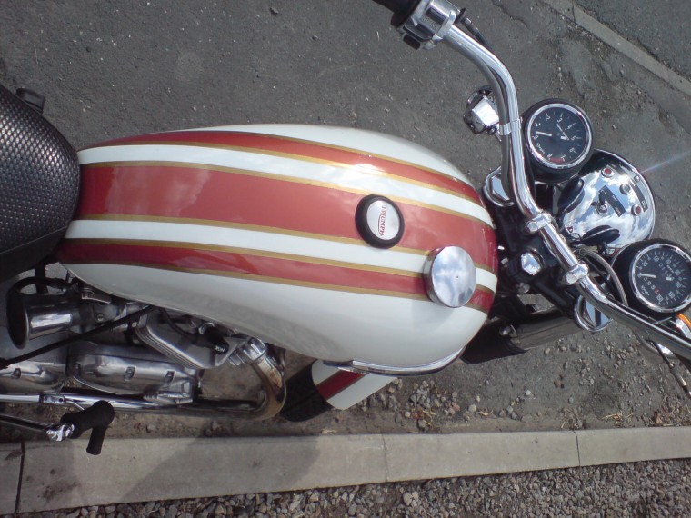 New parts include Panzon electronic ignition and coils, stainless rear mudguard with 66 rear light, grp front, new white paintwork, lightwight grp base race seat and retro side panels with the air box removed and bell mouth’s added.