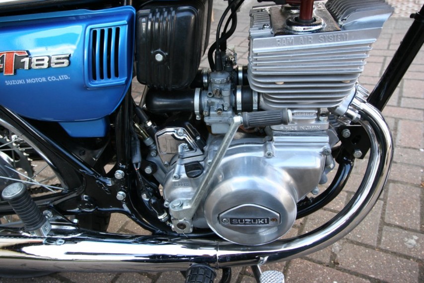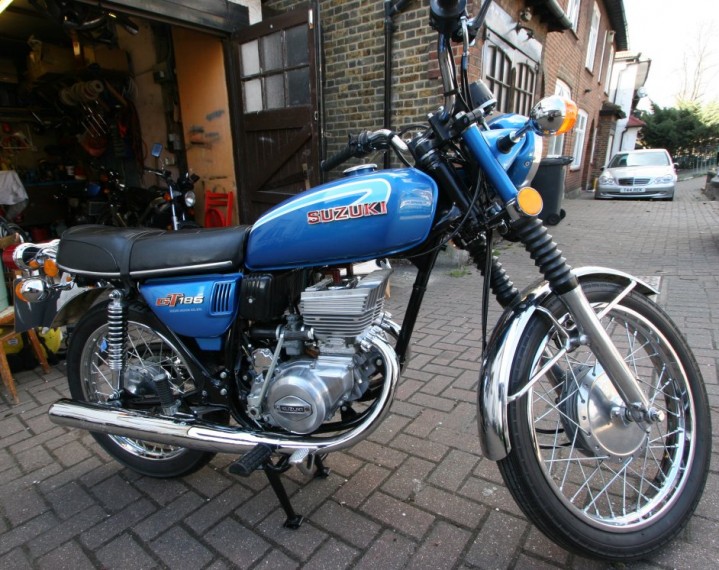 This is the first of the Suzuki GT185 range of bikes first registered in 1973 and known as the K model which had the twin leading drum brake on the front wheel, all the other models had a front disc brake.