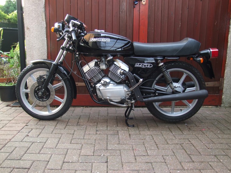 Originally red and gold with a seized engine where it had been stood for many years – I stripped it down and rebuilt it with a gloss black paint job for a change – might add some white/red paint panels at some stage to keep it looking like a Morini. Engine is a beaut, nice sound, torquey too for a small bike – really makes me grin despite my love af bigger bikes. Easy engine to work on too – ideal as a first restoration project. North Leicester Motorcycles are an excellent source of spares/help, highly recommended.
