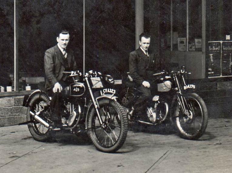 Add Your Photos!Thanks to Carrick Watson for this photo taken in 1947 showing his father, Jimmy Watson on a 1936 Excelsior Manxman and his Uncle Bill Watson on a new Trials AJS. They were Main Agents for AJS and Matchless for Lanarkshire in Scotland, taken at the garage in High Street Airdrie.