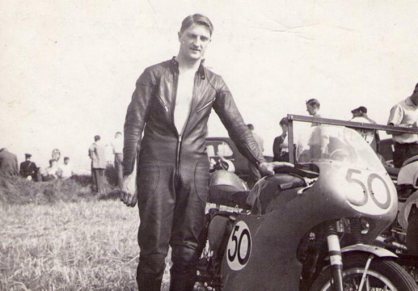 A picture of Alan Lawton sent in by Paul. The rear of the picture is inscribed "My first road race Carrowdor 100 1959 finished 5th "