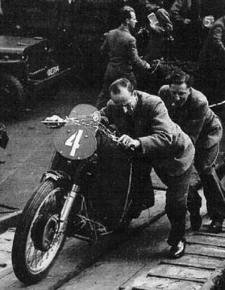 A picture of Bill Doran and Les Graham pushing an AJS Porcupine off the boat at the Isle of Man in 1951.  Many thanks to Phil Heath for sending the picture in.  Phill worked for Bill Doran and Matt Wright in the 60′s as a mechanic after leaving the army.