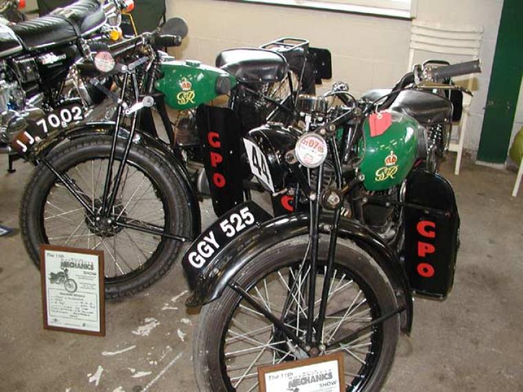 A lovely pair of GPO bikes seen at the 2004 Stafford Show.  The bike on the right is a 1941 BSA 250cc C10 that was restored in 2000.  The bike on the left is a 1933 BSA B33/1 – a 250cc sidevalve restored in 2003.  Both of these bikes would have been used by the Post Office to deliver telegrams.