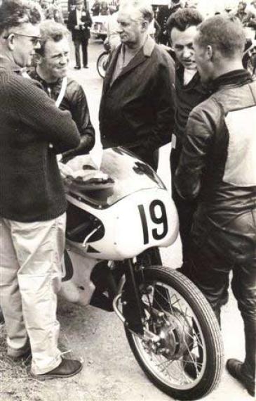Add Your Photos!Thanks to Jack Chaplin for this great picture of the RAFs very own Chris Conn on a Cotton at the 1965 TT when he finished 12th. The characters in the picture are, Allan Dudley Ward (on left) Chris Conn (on bike), an unknown South African gent(?), Jack Chaplin (in middle) and Jack thinks the rider on right is Peter Inchley.