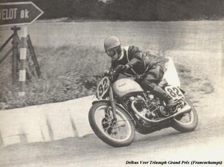 Thanks to Aad Weers of the Netherlands for sending in this picture. It shows the Dutch racer Drikus Veer on his Triumph GP at Francochamps.