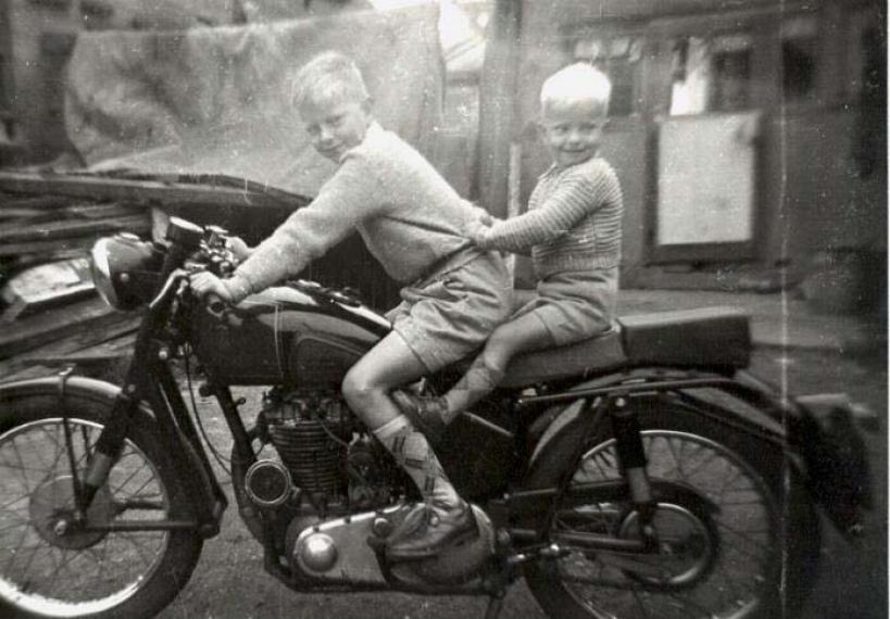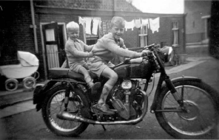 Add Your Photos!Thanks to Aad Weer for these great pictures! They are of Aad and his brother Dirk (front) on their Father’s 350cc Excelsior Manxman. The front and rear suspension were made by their Father. The all alloy engine is from the bike belonging to he Dutch racer Lo Simons. The picture was taken in Terbregge Rotterdam in 1959.