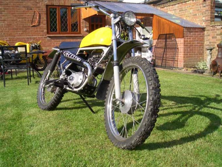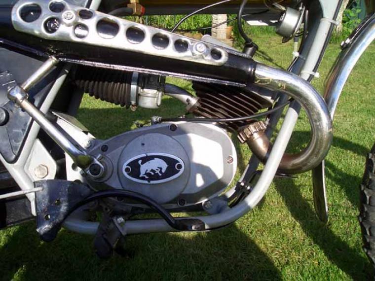 This is a moped with six gears! It has a minerelli 49.6cc power plant to make use of them, with 6.5bhp @ 7,000rpm from 12:1 compression ratio and breathing through a 14mm Dell’Orto carberetta. This incredible package is installed in a silver duplex frame and trimmed as a miniature street-trail. The clutch is multiplate imersed in oil, twin shocks at rear tele-hydraulic forks at front and drum brakes front and rear. Capable of top speeds of well over 50mph.