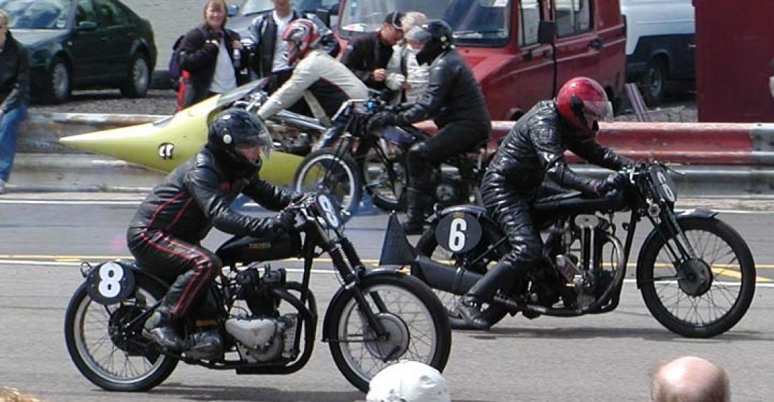 A Triumph and Norton-JAP Brooklands Special "giving it some"….