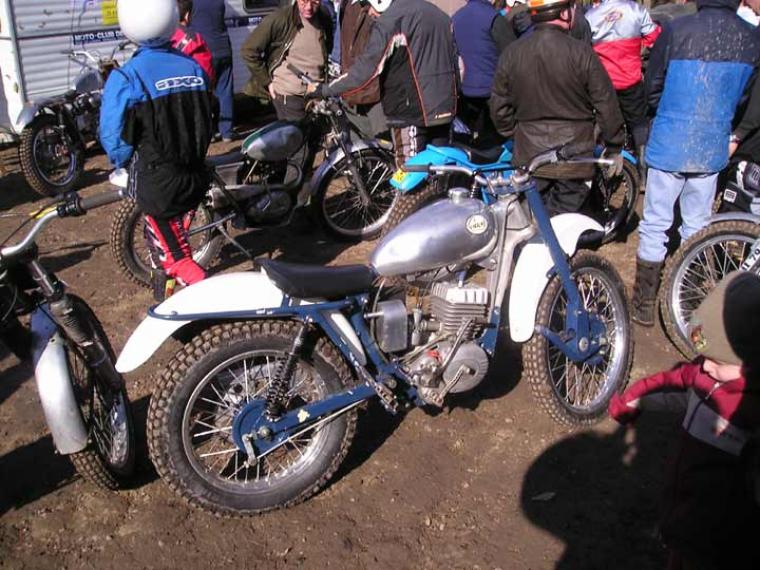 Many thanks to Gilles of Dunkerque, France for this nice picture.  It was taken at a vintage trials event at Wingles in the north of France in May 2005.  Thanks to Stuart Wigmore of the Greeves Rider’s Assocation for pointing out that this is a TES fitted with an odd barrel.