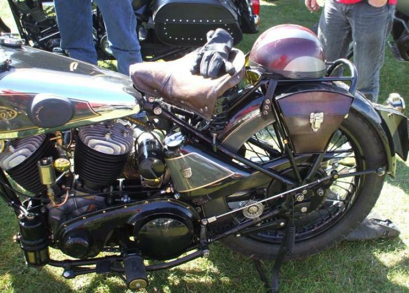 “I asked a Royal Enfield friend, and he can recognise bits of RE amongst the cycle parts. He also suggested that the motor looked “a bit AJS”, and after a scrounge I came up with the AJS 996cc “S2″ twin new for the 1931 season. It must have lasted only a year or two because by 1933 I think AJS twins used the familiar Matchless motor with the round timing chest and square tappet covers. I’ve never seen one in the flesh. Apparently the bike goes by the name of “1929 Jackson Indomitable 1000″. Given the motor and gearbox, “1929″ is an interesting date – perhaps the gas lights take it back a few years.