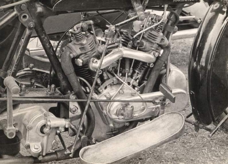 A very interesting old picture sent in by Andy Breeden.  It shows an early 1920′s 676cc Martinsyde V Twin machine featuring their own exhaust over inlet engine.  Martinsyde were a former aircraft factory that built bikes between 1919 and 1925.